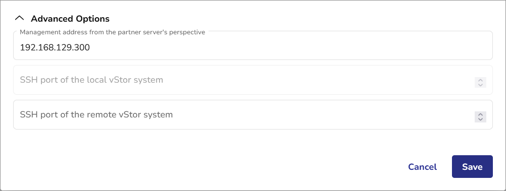 The Advanced Options section allows you to configure an alternate IP address for the partner to communicate with the local vStor. You can also specify alternate ports for SSH communication.
