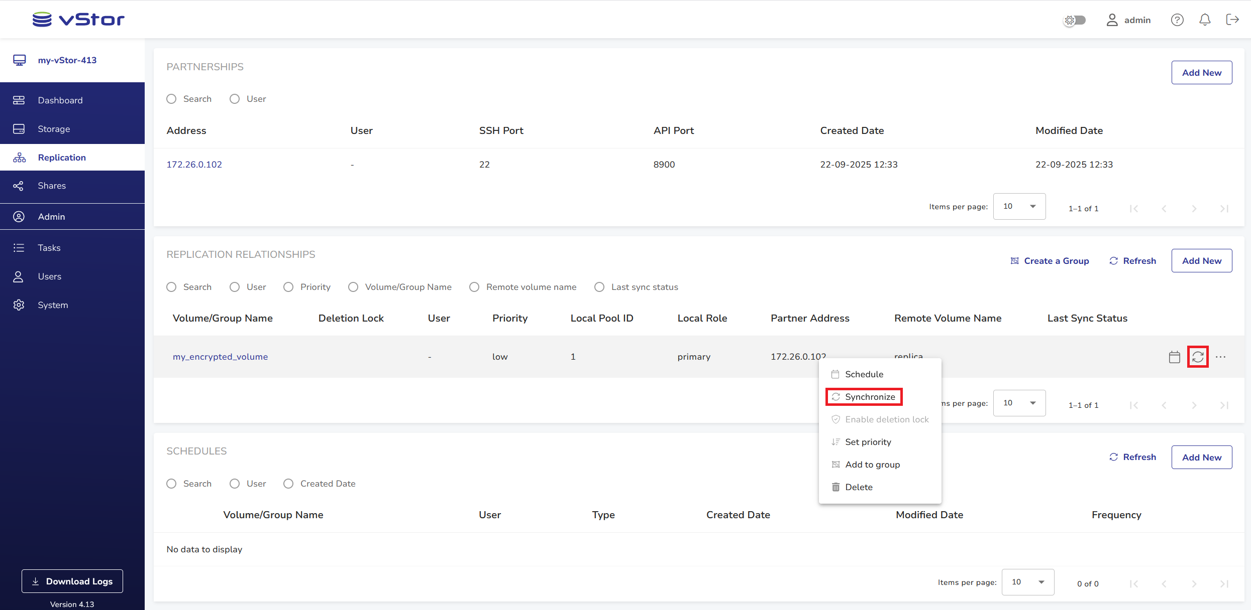 To manually synchronize data between the local volume and the replica on a partner vStor, hover over the replication relationship record or right-click the record and select Synchronize.