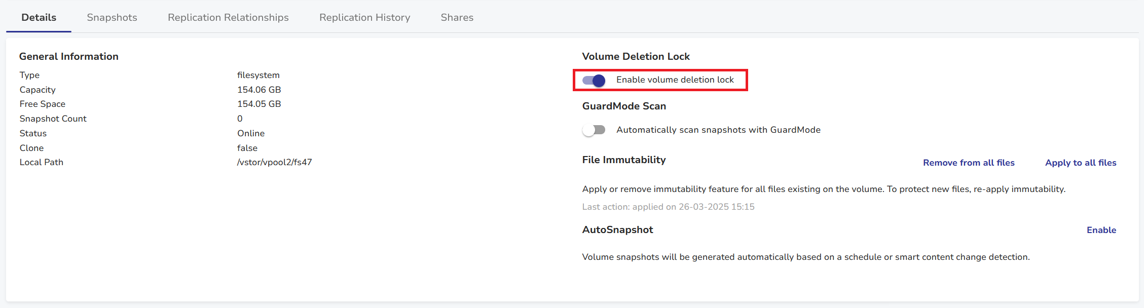 vStor supports deletion protection for volumes, preventing unauthorized or inadvertent deletion of volumes. This feature requires multifactor authentication.