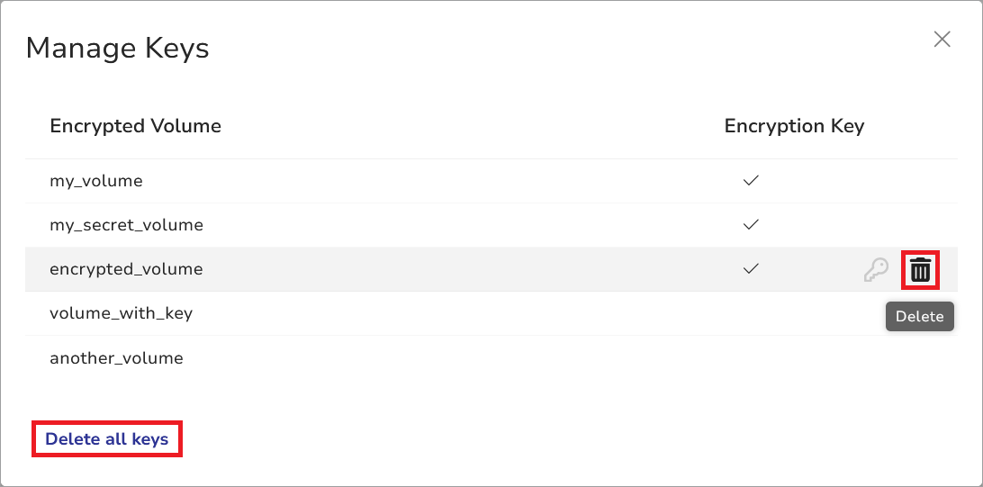 • In the key management interface for existing volumes, if the Enable encryption toggle was on during volume creation and the volume key has not been saved in the keystore.