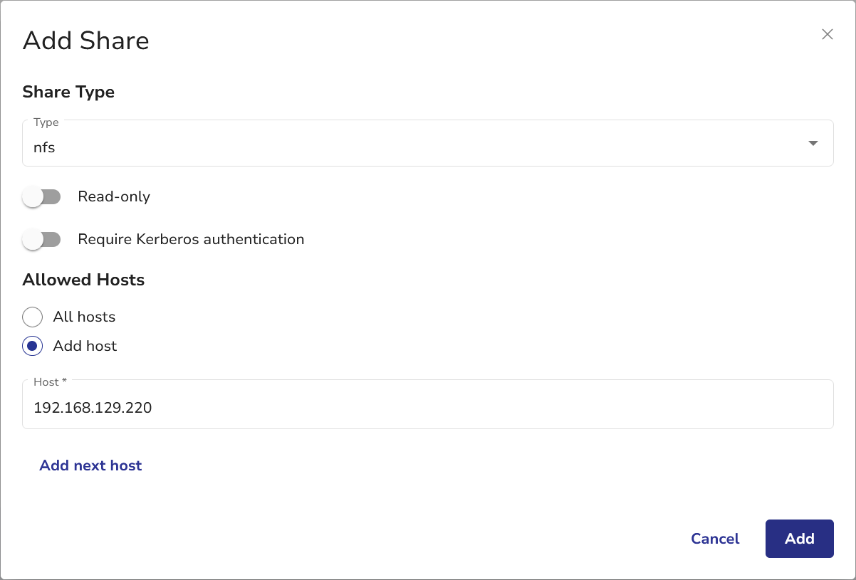 A connection check will be performed on each host. An error will be thrown for each unreachable host. You cannot add a share with one or more unreachable hosts.
