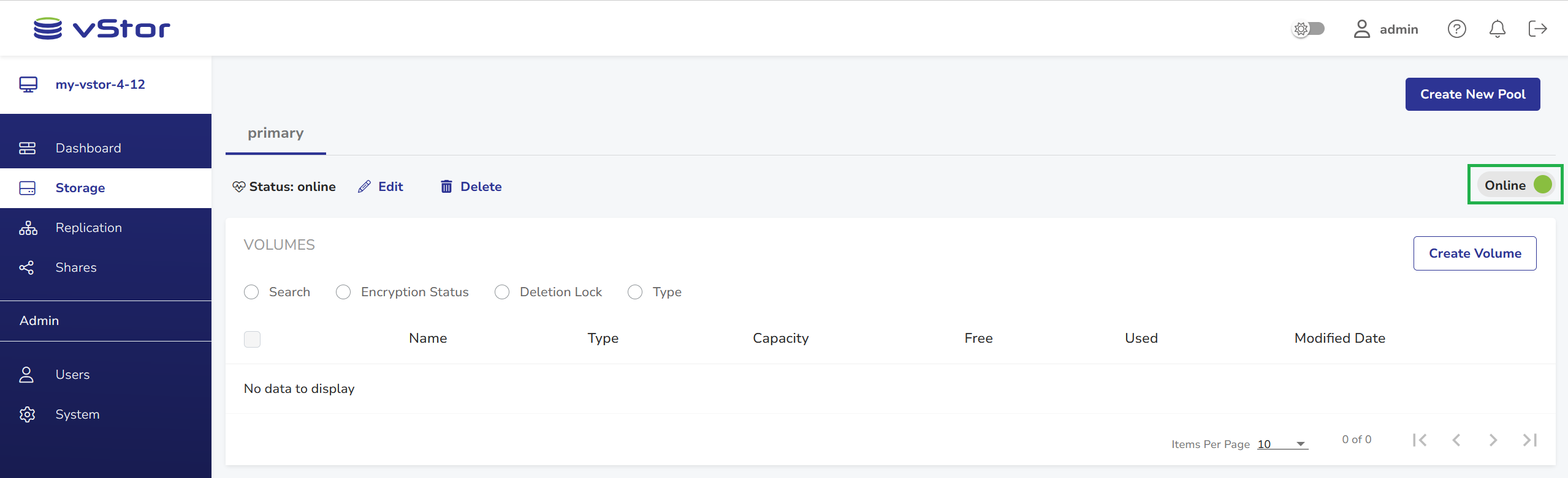 You can also create a storage pool using the vStor web interface by navigating to the Storage tab, clicking Create New Pool, and specifying its details:
