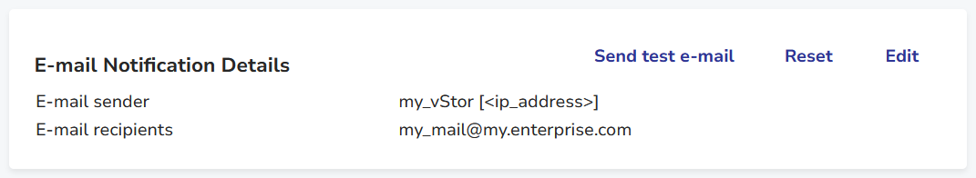 This section gathers e-mail notifications configuration for your vStor instance.