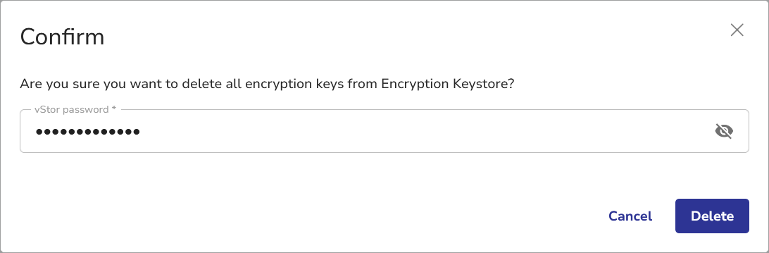 You can also delete all stored Encryption Keys using the Delete all keys button at the bottom of the Manage Keys dialog window. You will be prompted to confirm your decision by typing your vStor password. Click Delete.