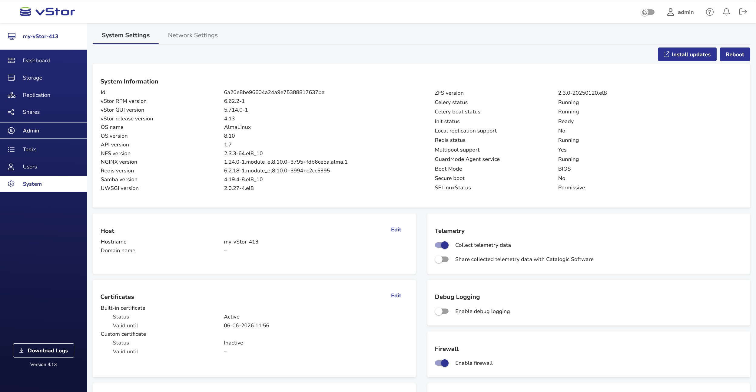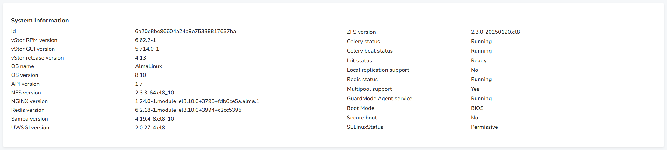 This section gathers general information about the vStorβs OS, library versions and statuses.