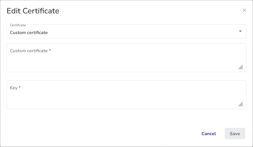 You can use the built-in certificate or add a custom one by selecting Custom certificate from the Certificate dropdown.