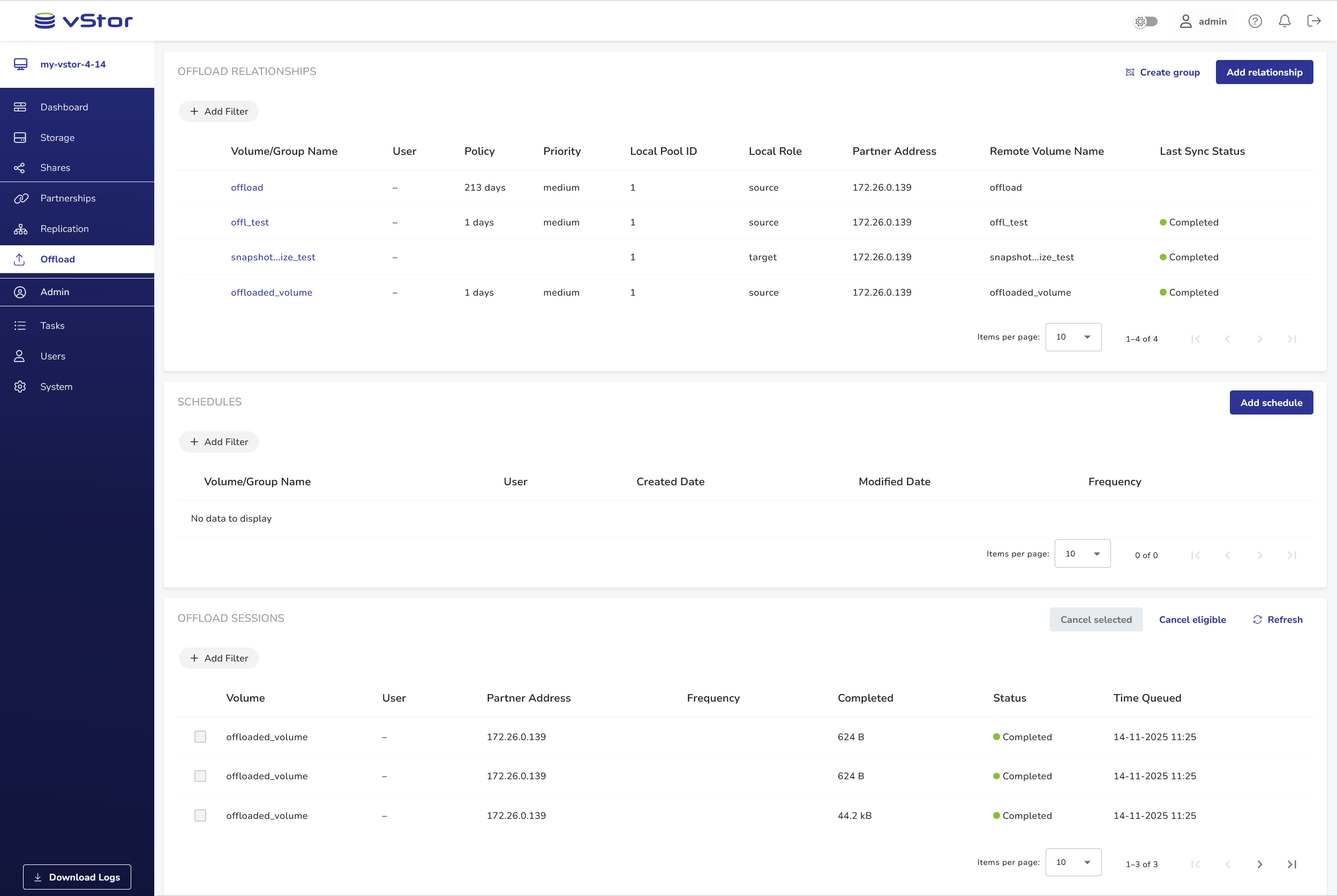 This section displays configured offload mappings between the local vStor and the partner vStor volumes.