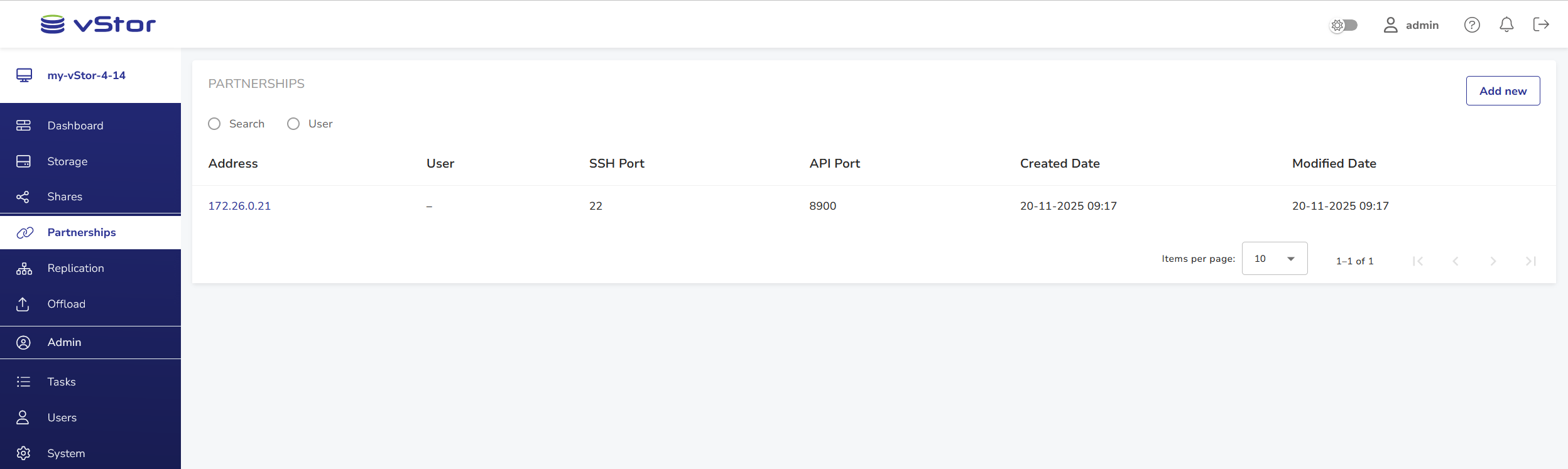 The Partnerships view provides an overview and management options for partnerships between the local vStor and remote systems. Establishing a partnership with another vStor is a prerequisite for replication and offload. Most features in the Replication and Offload views will be locked if no partnerships are established.