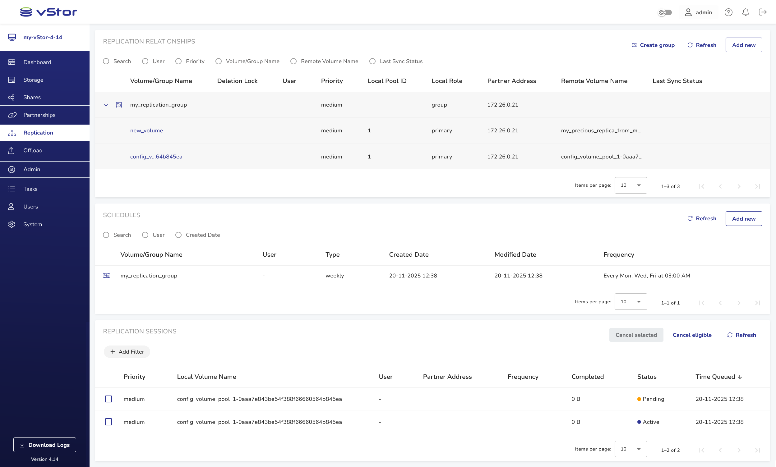 This section displays scheduled replication tasks for volumes.