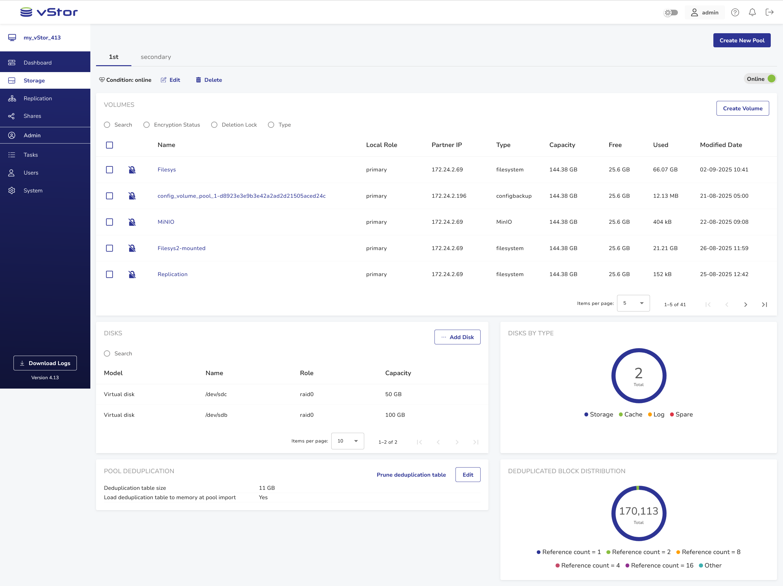 The Storage view is the vStor’s storage management section. The upper part consists of tabs, each representing a vStor pool, and features the Create New Pool button.